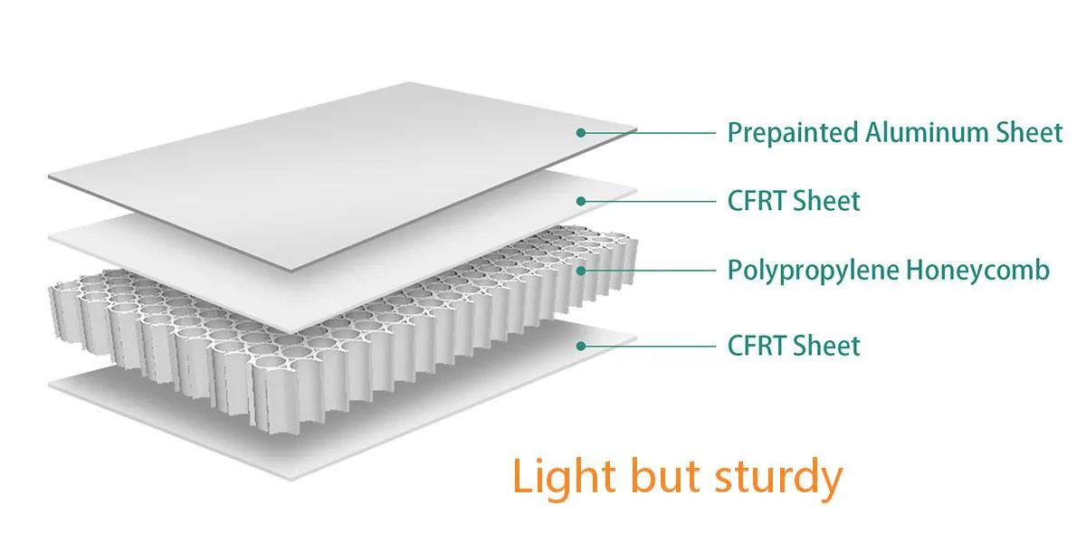 ●Soluția de tip fagure: ușurare extremă. Panourile noastre compozite oferă o rezistență egală sau mai mare decât oțelul reducând în același timp greutatea corporală cu 30% până la 50%.
